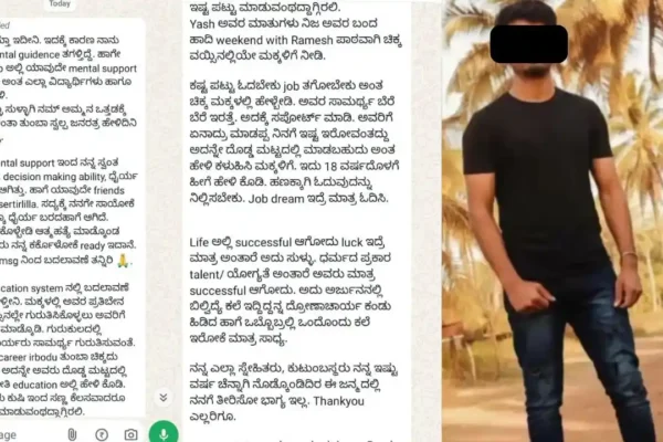 ಶಿಕ್ಷಣ ವ್ಯವಸ್ಥೆಯಲ್ಲಿ ಬದಲಾವಣೆ ತರಬೇಕೆಂದು ಡೆತ್ ನೋಟ್ ಬರೆದು ಯುವಕ ಆತ್ಮಹತ್ಯೆ A 21-year-old youth Rakesh committed suicide at his residence Shivamogga district. In his death note, he advised changes in the education system and urged that actor Yash’s life journey be taught to children as an inspirational lesson. ಶಿವಮೊಗ್ಗ ಜಿಲ್ಲೆಯ ಸೊರಬ ತಾಲ್ಲೂಕಿನ ಕೈಸೋಡಿ ಗ್ರಾಮದಲ್ಲಿ 21 ವರ್ಷದ ಯುವಕನೊಬ್ಬ…