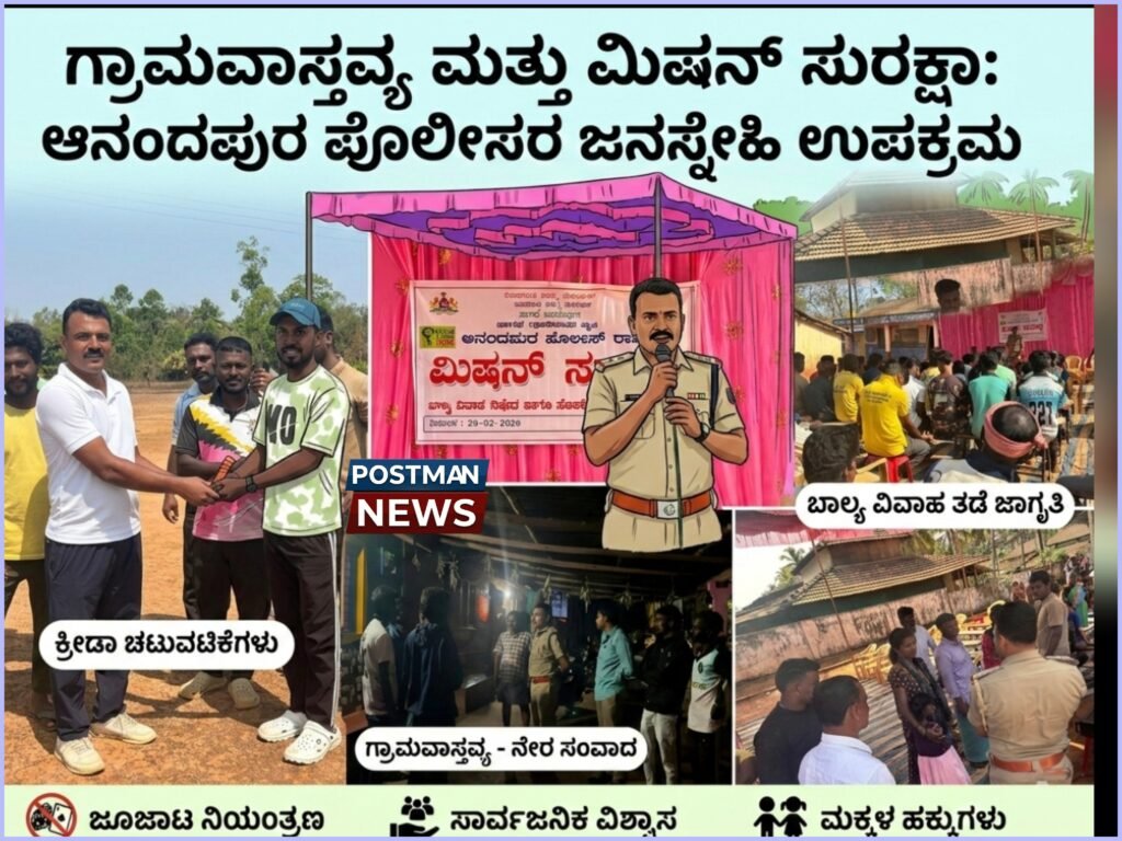 Anandapura Police conducted a village stay program at Karehonda in Sagara taluk, Shivamogga district, focusing on crime prevention, public interaction, Mission Suraksha awareness, child protection, and strengthening police–public trust. ಶಿವಮೊಗ್ಗ ಜಿಲ್ಲೆ, ಸಾಗರ ತಾಲೂಕು: ಗ್ರಾಮೀಣ ಜನರ ಸಮಸ್ಯೆಗಳಿಗೆ ನೇರವಾಗಿ ಸ್ಪಂದಿಸುವುದು, ಅಪರಾಧ ತಡೆಗಟ್ಟುವುದು ಹಾಗೂ ಪೊಲೀಸ್–ಸಾರ್ವಜನಿಕರ ನಡುವಿನ ವಿಶ್ವಾಸವನ್ನು ಬಲಪಡಿಸುವ ಉದ್ದೇಶದಿಂದ ಆನಂದಪುರ ಪೊಲೀಸ್ ಠಾಣೆ ವ್ಯಾಪ್ತಿಯಲ್ಲಿ ಗ್ರಾಮವಾಸ್ತವ್ಯ ಕಾರ್ಯಕ್ರಮವನ್ನು ಯಶಸ್ವಿಯಾಗಿ ಆಯೋಜಿಸಲಾಯಿತು. ಪಿಎಸ್ಐ…