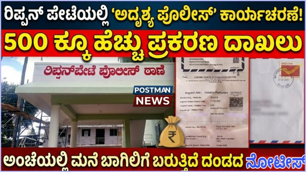 Over 500 traffic violation cases have been registered in Ripponpet under the ITMS system, with penalty notices being sent directly to vehicle owners’ homes via post for rule violations. ಸಂಚಾರ ನಿಯಮ ಉಲ್ಲಂಘನೆಗೆ ‘ಅದೃಶ್ಯ ಪೊಲೀಸ್’ ಕಣ್ಣು : 500ಕ್ಕೂ ಹೆಚ್ಚು ಪ್ರಕರಣ ದಾಖಲು, ಮನೆ ಬಾಗಿಲಿಗೆ ಅಂಚೆ ಮೂಲಕ ದಂಡದ ನೋಟಿಸ್! ರಿಪ್ಪನ್ ಪೇಟೆ : ರಸ್ತೆಯಲ್ಲಿ ಪೊಲೀಸ್ ಕಾಣಿಸಿದರೆ ಹೆಲ್ಮೆಟ್ ತಕ್ಷಣ ತಲೆಗೆ…