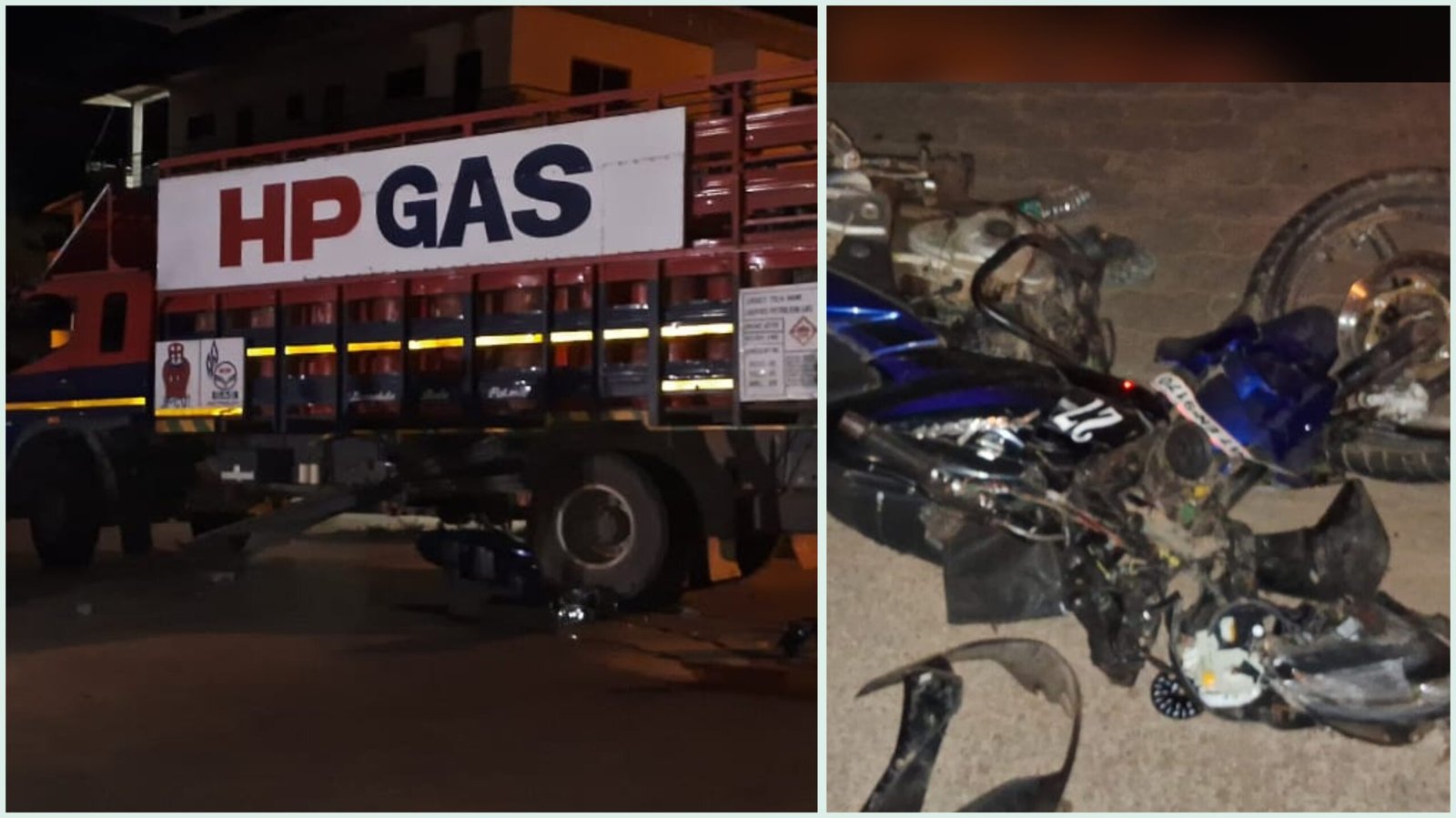 ಶನಿವಾರ ಮಧ್ಯರಾತ್ರಿ 1:30ರ ಸುಮಾರಿಗೆ ಗ್ಯಾಸ್ ಲಾರಿ ಮತ್ತು ಬೈಕ್ ನಡುವೆ ಸಂಭವಿಸಿದ ಭೀಕರ ಅಪಘಾತದಲ್ಲಿ ಬೈಕ್ ಸವಾರರಾದ ಸುದೀಪ್ (25) ಮತ್ತು ಸುಧೀಶ್ (30) ಎಂಬ ಯುವಕರು ಪ್ರಾಣ ಕಳೆದುಕೊಂಡಿದ್ದಾರೆ.