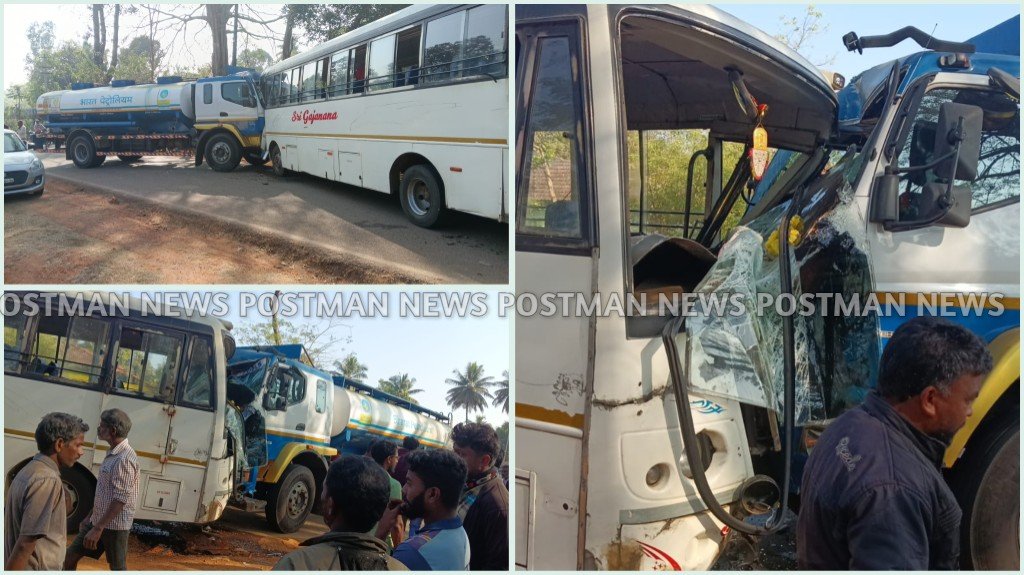 ಗಜಾನನ ಬಸ್ ಹಾಗೂ ಪೆಟ್ರೋಲ್ ಟ್ಯಾಂಕರ್ ನಡುವೆ ಮುಖಾಮುಖಿ ಡಿಕ್ಕಿಯಾಗಿದ್ದು ಘಟನೆಯಲ್ಲಿ ಬಸ್ಸಿನಲ್ಲಿದ್ದ ವಿದ್ಯಾರ್ಥಿಗಳು ಸೇರಿದಂತೆ ಹಲವರಿಗೆ ಸಣ್ಣಪುಟ್ಟ ಗಾಯಗಳಾಗಿದ್ದರೆ ಓರ್ವ ಮಹಿಳೆಗೆ ತಲೆಗೆ ಗಂಭೀರ ಪೆಟ್ಟಾಗಿ ಪ್ರಜ್ಞಾಹೀನ ಸ್ಥಿತಿಯಲ್ಲಿದ್ದಾರೆ ಎಂದು ತಿಳಿದುಬಂದಿದೆ.