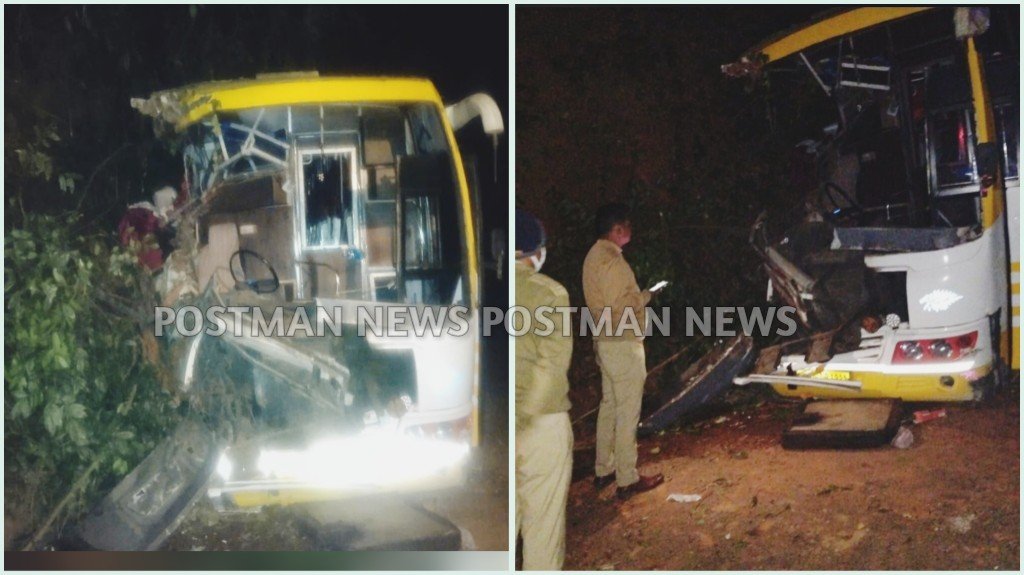 A private bus belonging to Durgamba Sanstha, which was travelling from Davangere to Mangaluru, crashed into the ground after the driver lost control at Hulikal Ghati. The front of the bus was completely damaged due to the severity of the collision.