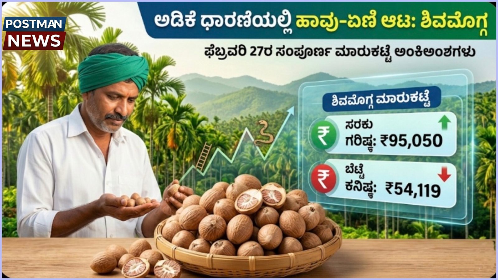 Arecanut prices in Shivamogga district show fluctuations as on February 27. Check today’s complete market-wise arecanut rates in quintals, comparison with February 26 prices, and updates for Shivamogga and Bhadravati markets.