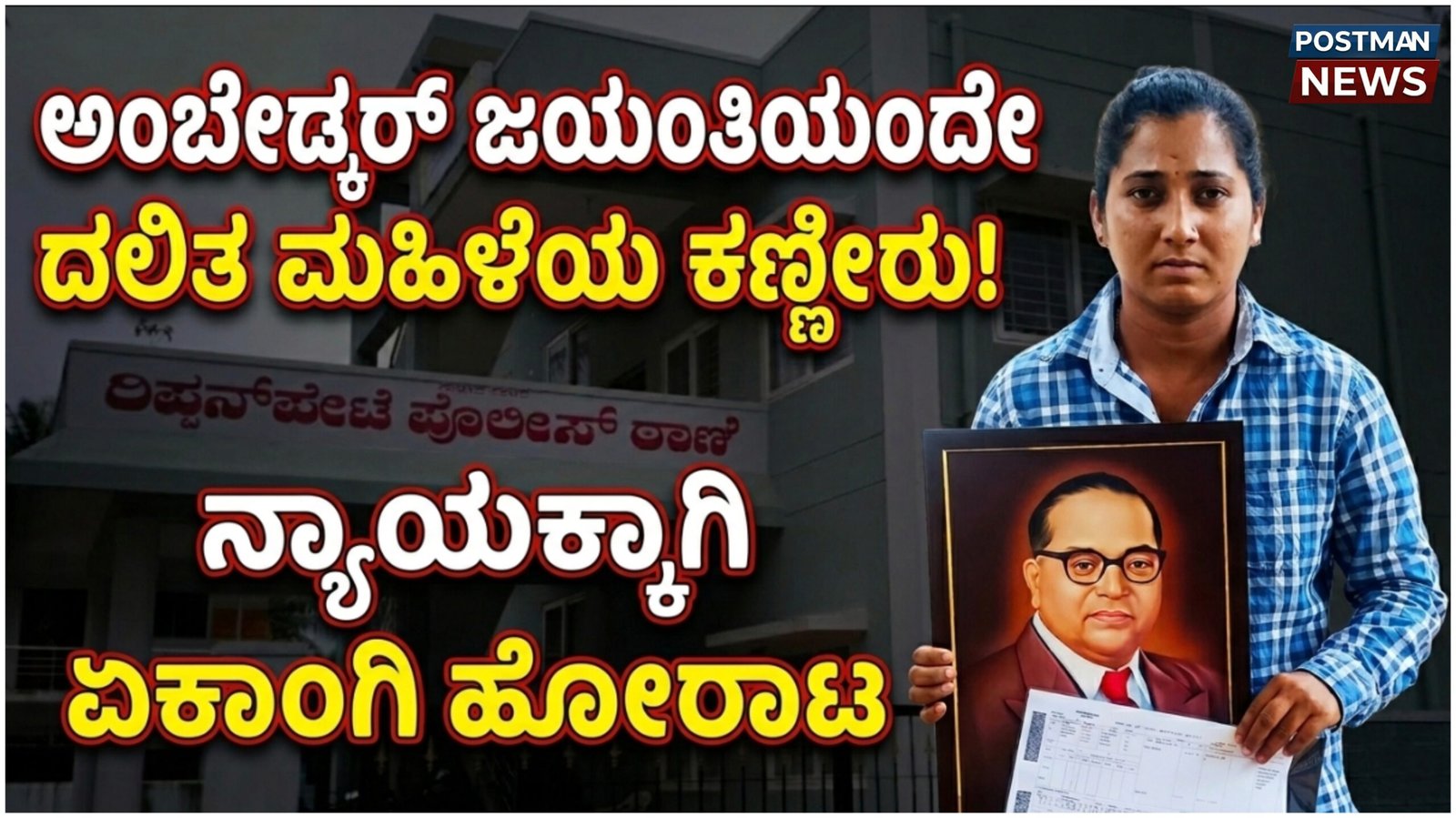A woman staged a solo protest in front of Ripponpet police station holding Dr. Ambedkar’s photo, alleging land encroachment and seeking justice and protection from authorities.