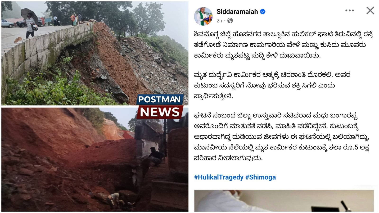 Karnataka CM Siddaramaiah announces ₹5 lakh compensation for families of three workers killed in Hulikal Ghat landslide in Shivamogga. Four others are critically injured.