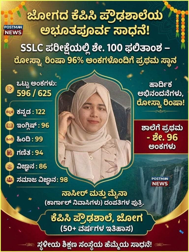 ಜೋಗದ ಕೆಪಿಸಿ ಪ್ರೌಢಶಾಲೆಗೆ ಶೇ.100 ಫಲಿತಾಂಶ – ರೋಸ್ನಾ ರಿಂಷಾ 96% ಅಂಕಗಳೊಂದಿಗೆ ಪ್ರಥಮ ಸ್ಥಾನ