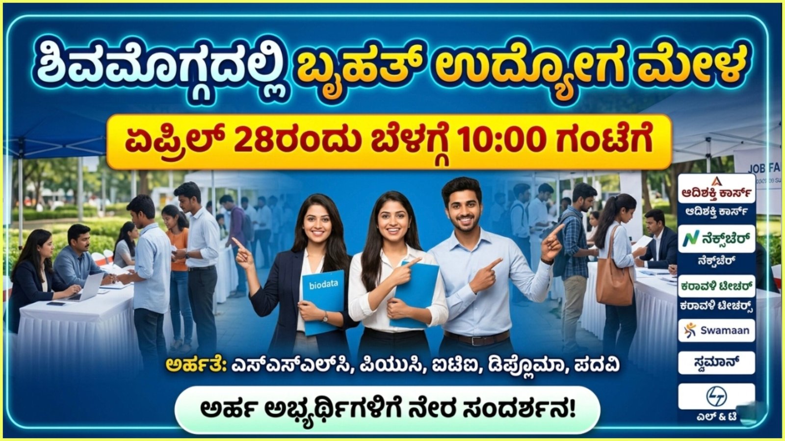 ಶಿವಮೊಗ್ಗದಲ್ಲಿ ಏಪ್ರಿಲ್ 28ರಂದು ಉದ್ಯೋಗ ಮೇಳ – ವಿವಿಧ ಕಂಪನಿಗಳಿಂದ ನೇರ ಸಂದರ್ಶನ