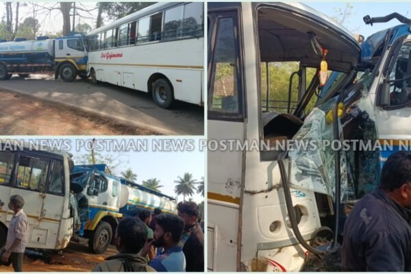 ಬಸ್ ಹಾಗೂ ಟ್ಯಾಂಕರ್ ನಡುವೆ ಡಿಕ್ಕಿ , ಹಲವರಿಗೆ ಗಾಯ – ಓರ್ವ ಮಹಿಳೆ ಗಂಭೀರ