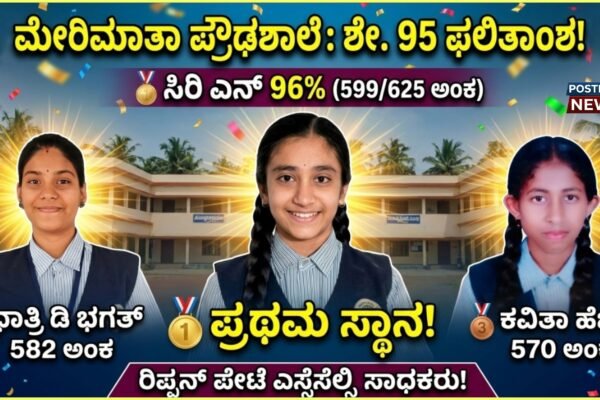 ಮೇರಿಮಾತಾ ಪ್ರೌಢಶಾಲೆಗೆ ಶೇ.95 ಫಲಿತಾಂಶ – ಸಿರಿ ಎನ್ 96% ಅಂಕಗಳೊಂದಿಗೆ ಪ್ರಥಮ Marymatha High School in Ripponpet records 95% SSLC results, with Siri N securing first rank by scoring 96% (599/625). ರಿಪ್ಪನ್ ಪೇಟೆ: ಈ ಸಾಲಿನ ಎಸ್ಎಸ್ಎಲ್ಸಿ ಪರೀಕ್ಷೆಯಲ್ಲಿ ಪಟ್ಟಣದ ಮೇರಿಮಾತಾ ಪ್ರೌಢಶಾಲೆ ಶೇ.95 ಫಲಿತಾಂಶ ದಾಖಲಿಸಿ ಗಮನ ಸೆಳೆದಿದೆ. ಶಾಲೆಯ ವಿದ್ಯಾರ್ಥಿನಿ ಸಿರಿ ಎನ್ 625ರಲ್ಲಿ 599 ಅಂಕಗಳನ್ನು ಪಡೆದು ಶೇ.96 ಸಾಧನೆ ಮಾಡುವ ಮೂಲಕ…